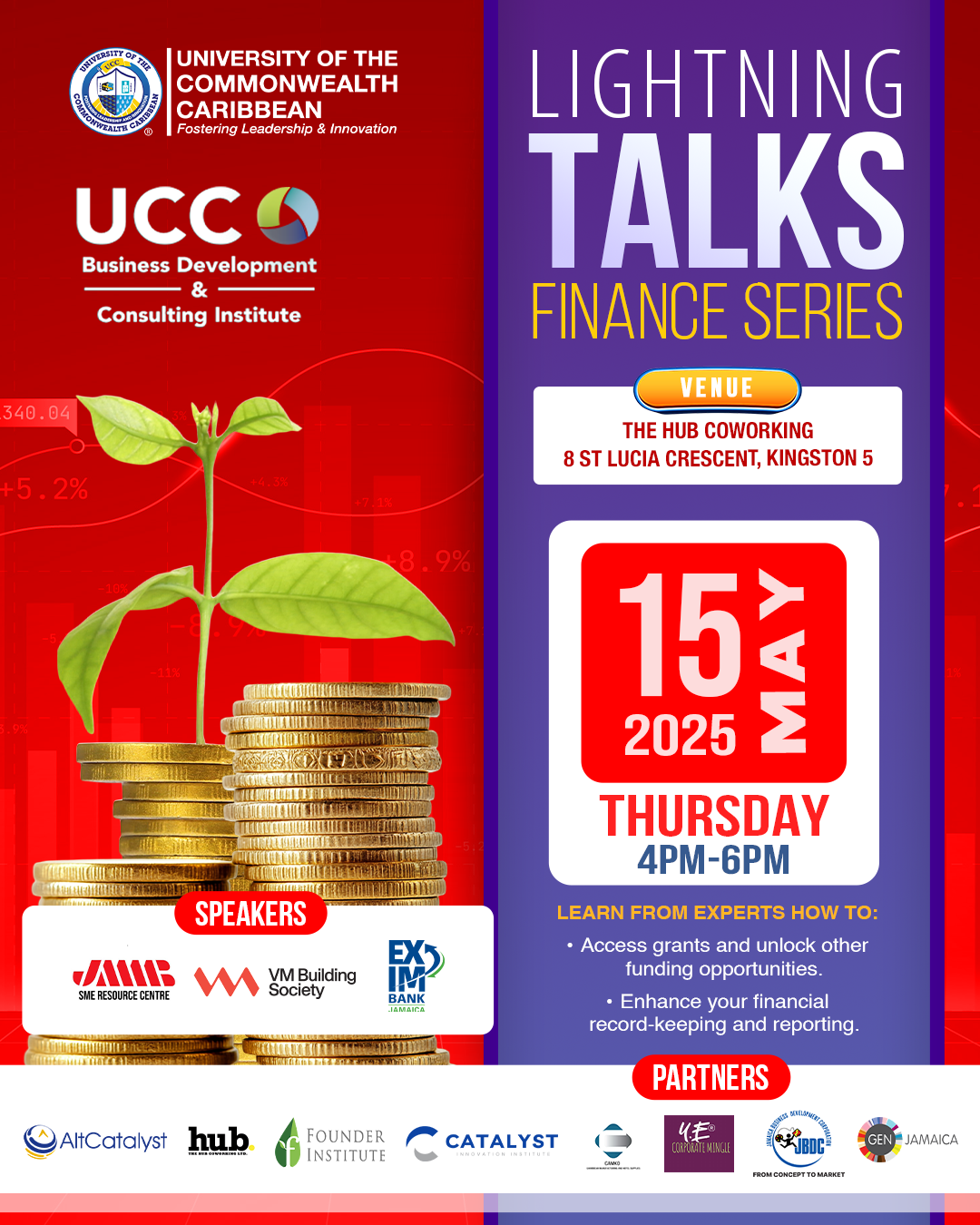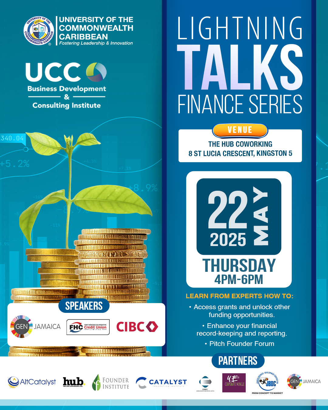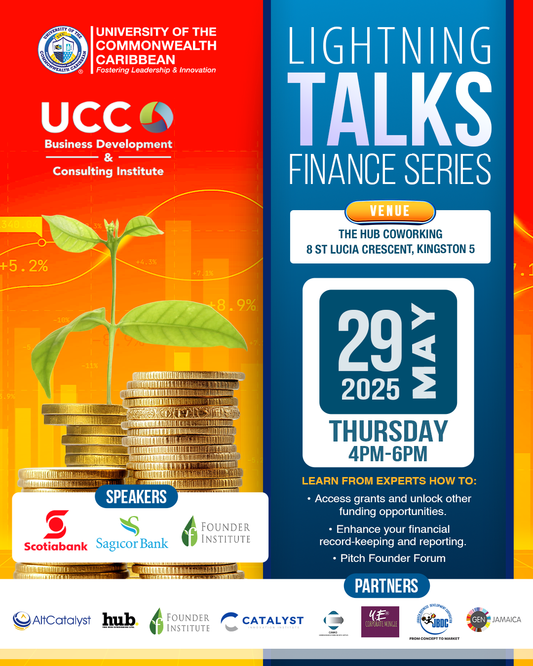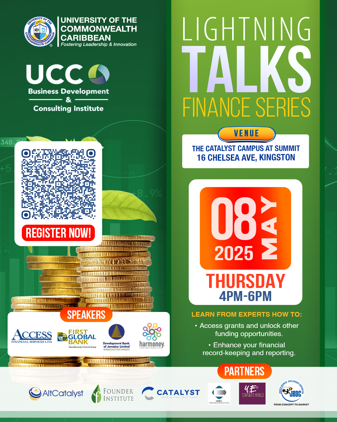 The University of the Commonwealth Caribbean Business Development and Consulting Institute (UCC BDCI) officially launched the Lightning Talks Finance Series on May 1, 2025, at the NovaMed Co-Working Hub, Summit Hotel, Kingston. Held in collaboration with AltCatalyst, Founder Institute Jamaica, and Catalyst/NovaMed, the afterwork event brought together financial experts, entrepreneurs, and stakeholders in a dynamic session focused on improving access to finance for MSMEs and various enterprises.